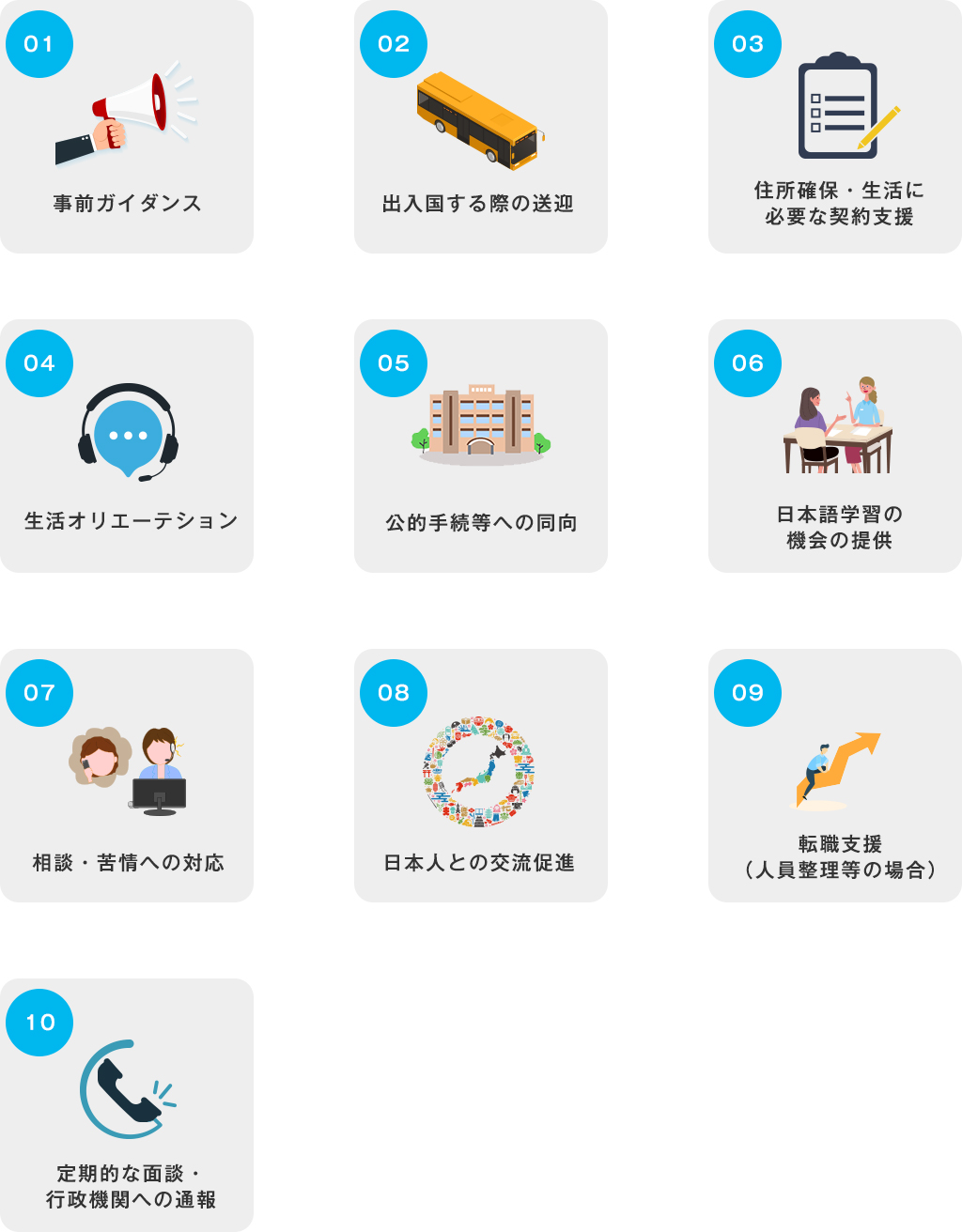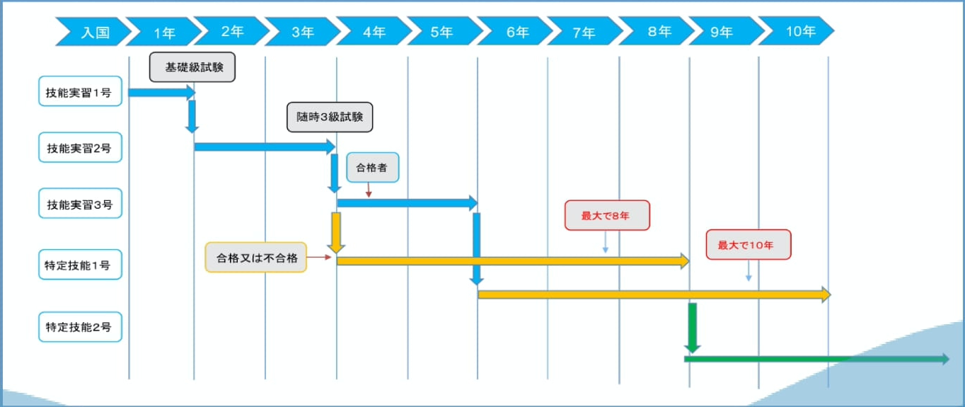| ⑤ 技能実習から継続して働いてもらえる | 技能実習修了した後であれば、特定技能評価試験と日本語評価試験を受けなくても在留資格「特定技能」に移行できる可能性があります。そのため、技能実習修了後、さらに5年間日本で就労することが可能になります。 | |